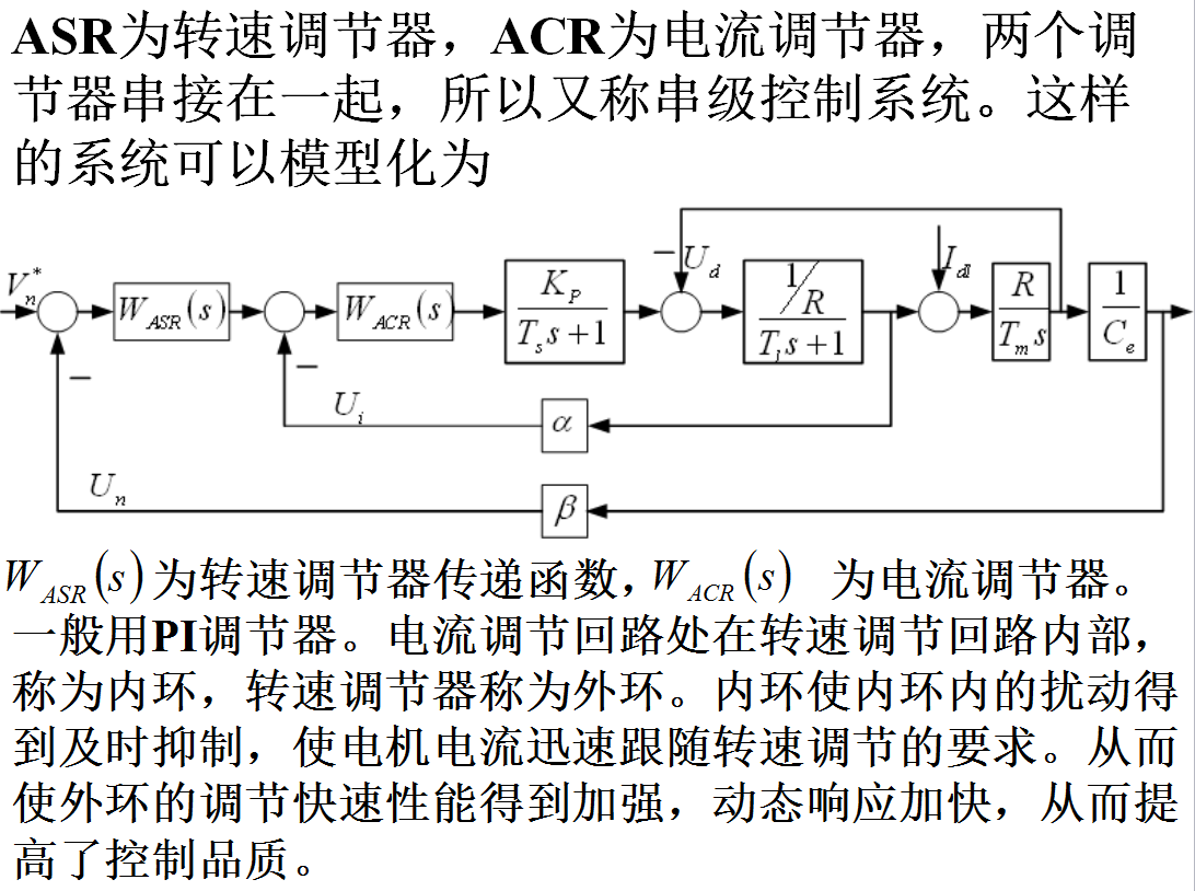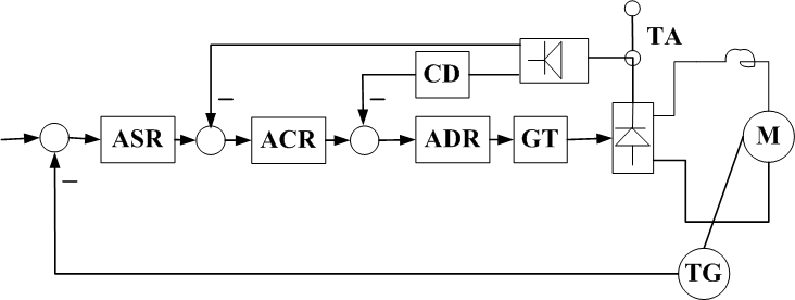 为进一步提高控制的及时性,在双闭环直流调速系统上还可再加入一个内环控制。就成为带电流变化率控制内环的三环直流调速系统。在这个系统中新添的调节器是ADR。ADR接受来自可控硅电流的微分信号,所以调节的主要变量是电流变化率。这样,ASR用于调节转速,ACR用于调节电流,ADR专用于调节电流变化率,三个调节器的串联起来使用,各司其职,使系统的控制作用细化和强化。从而减小了控制对象的惯性影响,及时抑制了各回路中可能出现的扰动,使控制品质比单闭环控制时大为提高。