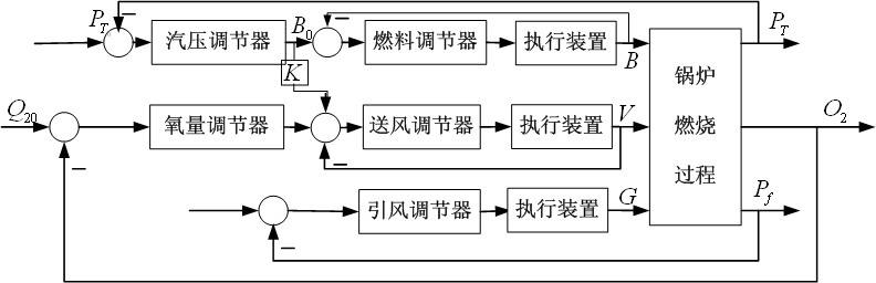 燃烧控制系统有三个被调量:炉膛压力Pf、主汽压力PT 和烟气含氧量O2。这三个被调量与三个控制量:燃料量B 、送风量V和引风量G构成了燃烧对象的输入和输出。