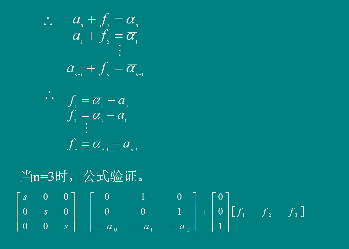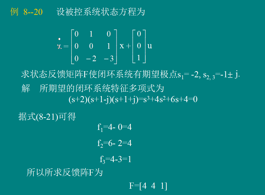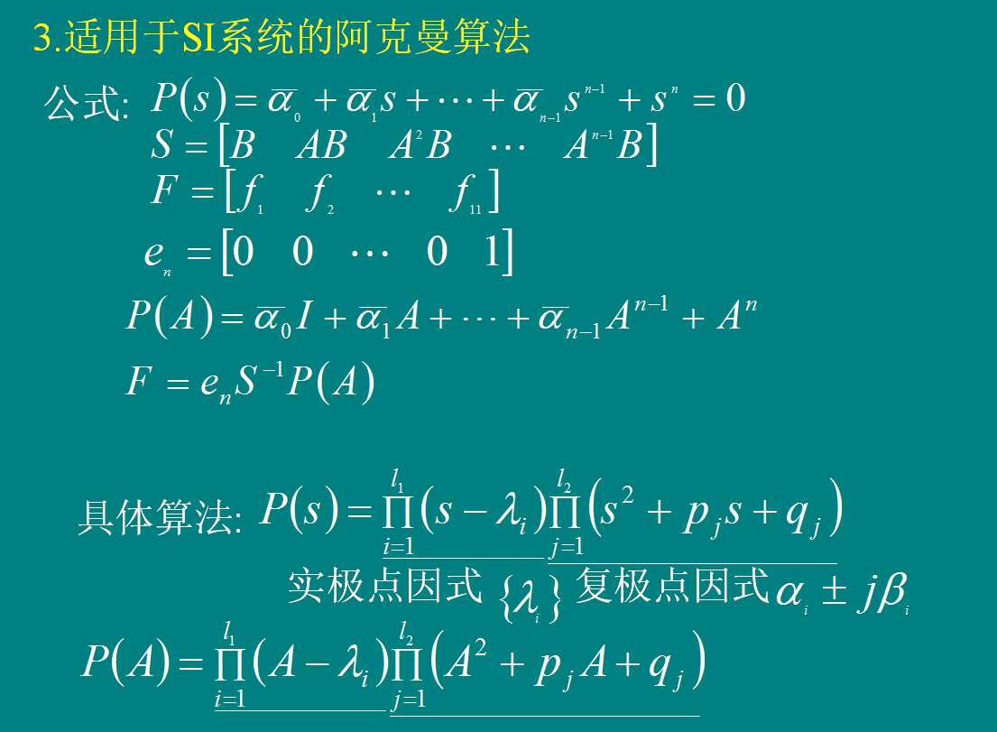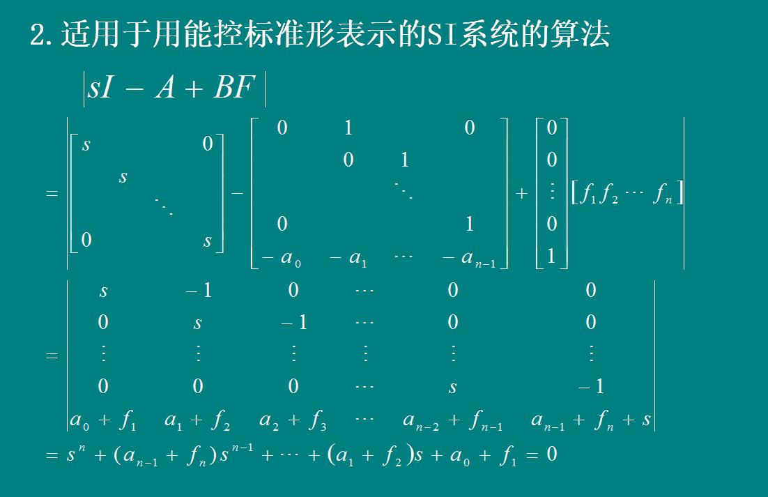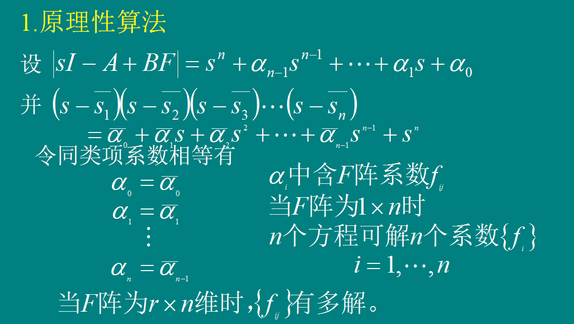 定理:对于状态反馈控制系统,只要(A,B,C)状态能控,则闭环极点可通过F任意配置。注:1.此定理适用于单变量也适用于多变量系统。2.在SISO系统中,有唯一解。在MIMO系统中,解不唯一,有自由度考虑其它要求。3.在SISO系统中,F的设计不改变系统零点,但在MIMO系统中则不一定,则使配置复杂化。