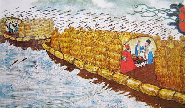三国时期,孙刘联军和曹操在赤壁对峙。周瑜嫉妒诸葛亮的才智。想除掉诸葛亮,于是刁难诸葛亮要他在十日之内造十万支箭。诸葛亮料定过几天有大雾,于是便答应,到了第三天夜里。诸葛亮向鲁肃借了一些船只,船上放满草人,一字排开向曹操营寨驶去。江面上雾很大,曹操不清楚敌军虚实。于是叫将士疯狂放箭。箭射满了草船。诸葛亮满载而归,使自己这方的军事装备实力有了一定的提高。