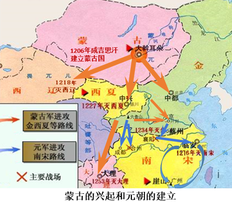 在宋朝镇压方腊起义的第二年,北方崛起的金国兴兵南下,仅以13年时间,相继攻灭辽和北宋。随后,与南宋隔江南北分立,双方南侵北抗30多年。其间,在各统治区分别爆发了钟相、杨幺起义和红巾军起义。正当金、宋都无力打破对峙局面时,漠北蒙古汗国兴起。其统治者凭借骑兵优势,以和林为中心,向四周作离心攻略。一方面远征西域,灭国数十拓地万里;一方面渡漠南下,攻灭夏、金和南宋,建立了规模空前的大统一元王朝。晚期,刘福通、徐寿辉等领导的红巾军,在大江南北展开了大规模的武装反抗斗争。