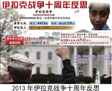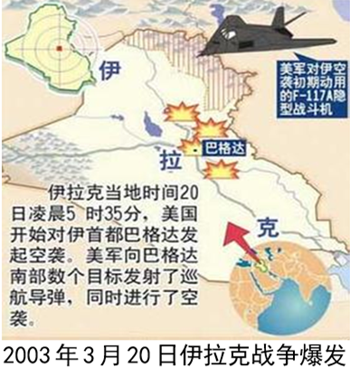 2003年3月20日美英联军以伊拉克藏有大规模杀伤性武器并暗中支持恐怖分子为由,绕开联合国安理会,向伊拉克发动代号为“斩首行动”和“震慑”行动的大规模空袭和地面攻势。
