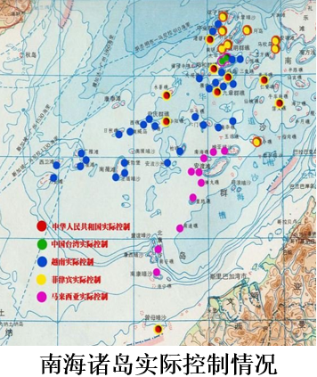 菲律宾控制10处:中业岛、马欢岛、费信岛、南钥岛、北子岛、西月岛、杨信沙洲、司令礁、火艾礁、仁爱礁。
