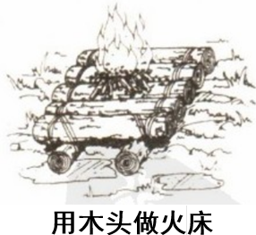取火。取火前,应该细心地挑选一块非常结实的地面作为适合的燃火地点。避免强风,降水,防止引燃周围的植被以及设备与器材。如在湿地上生火,应先用木头做火床。