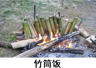 鱼等物去内脏并脱毛或去鳞,放在泥饼上,用泥饼将食物包裹成团,放在火中烧两个小时即可食用。竹节。选粗壮的竹砍倒,每2~3节竹筒砍成段,将竹节的一端打通,将米和水灌入竹节里,水约占2/3,然后将竹节放在火中烘烤,约40分钟可做成熟饭。