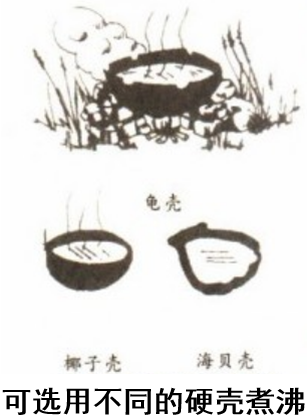 脸盆、罐头盒、钢盔充作锅。用石头做架,或用铁丝吊挂脸盆、铁盒等物,用火加热,烹煮食物、烧开水等。铁丝、木棍。可将食物穿插缠裹在铁丝或木桃上,放在火边烧烤熟化。石板或石块。用火将石板烧烫以后,将食物切成薄片放在上面烙熟。