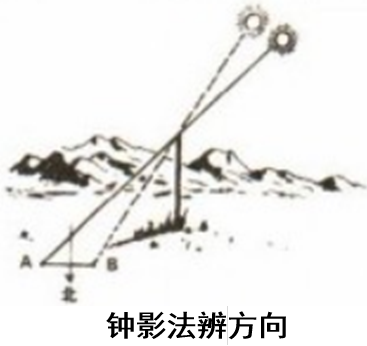 基本方法是:用一根标杆(直杆),使其与地面垂直,把一块石子放在标杆影子的顶点A处。约10分钟,标杆影子的顶点移动到B处时再放一块石子,将A、B两点连成一条直线,这条直线的指向是东西方向,与AB线垂直的方向则是南北方向,向太阳的一端是南方,相反方向是北方。回归线以南地区不适于这种辨向方法。