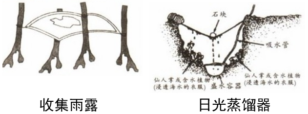 日光蒸馏。在地面挖一大约宽90厘米、深45厘米的坑。坑底部中央放一收集皿,在坑上悬一条拉成弧形的塑料膜。光能升高坑内潮湿土壤和空气的温度,蒸发产生水汽,水汽逐渐饱和。与塑料膜接触遇冷凝结成水珠,下滑至收集器皿中。这种方法适用于沙漠地区或者日夜温差相当大的地区。