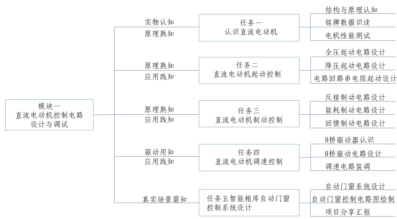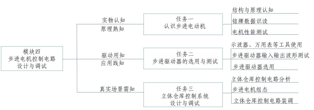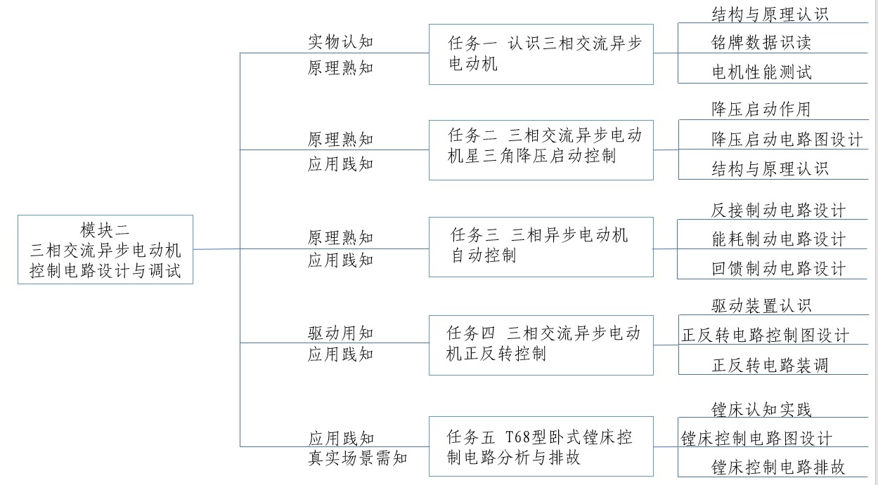 《电机与电气控制》课程按照实物认知→原理熟知→驱动用知→应用践知→真实场景需知的思路,选取自动化类专业就业的典型岗位任务所需接触到的直流电机、异步电机、步进电机、伺服电机等作为教学内容,对课程结构进行了重构,课程结构与内容设计如图1所示,四个模块的教学内容设计依次如图1-图5所示。