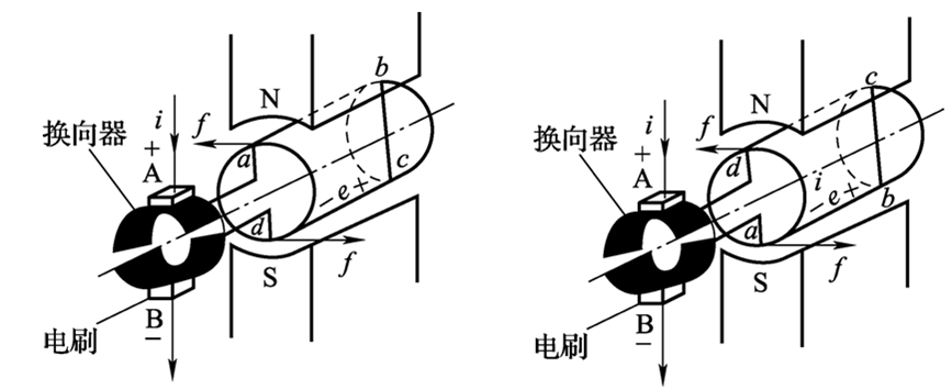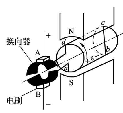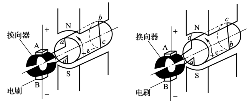 线圈中的感应电动势的方向改变:为了保证输出电动势的方向不变,保持电刷静止不动