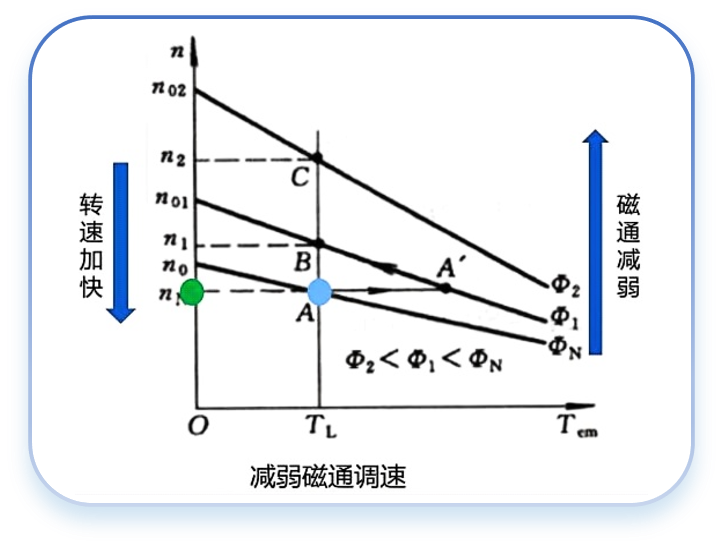2.特点: (1)设备简单,投资少 (2)属于恒转矩调速方式,转速只能由额定转速向下调。 (3)只能分级调速,调速平滑性差。 三.弱磁调速:一般采取在励磁回路中串联励磁电阻的方法来减弱磁通。