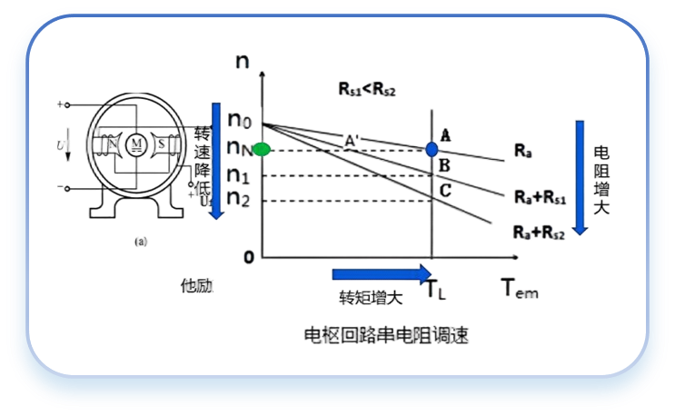 2.特点: (1)改变电枢电压调速时,机械特性曲线的斜率不变,所以,调速的稳定性好。 (2)电压可做连续变化,调速的平滑性好,调速范围广。 (3)属于恒转矩调速,电动机不允许电压超过额定值,只能由额定值向下降低电压调速,即只能减速。 (4)电源设备的投资费用较大,但电能损耗小,效率高。 二. 电枢回路串电阻调速 1.电路与机械特性分析: