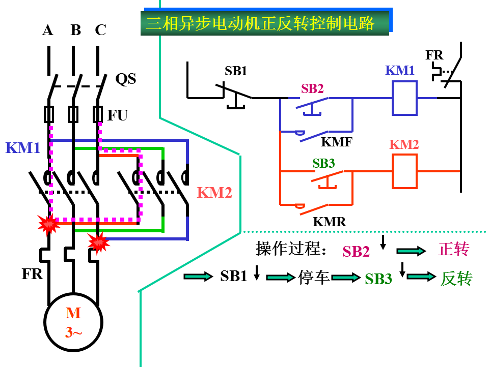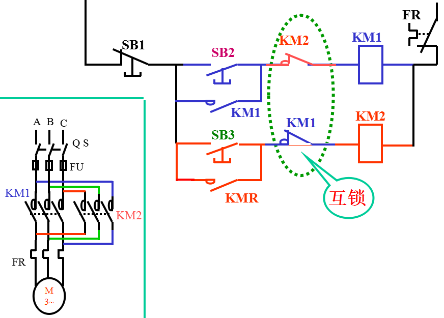 互锁作用:正转时,SB3不起作用;反转时,SB2不起作用。从而避免两触发器同时工作造成主回路A、C相短路。