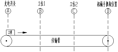 工件传输系统如图1所示,图中A点装有关电开关,用于检测传输带上是否有工件。B点、C点、D点分别装有限位开关SQ1、SQ2、SQ3用于表示工件1、工件2及机械手的抓取位置。传输带有三相异步交流电动机驱动。