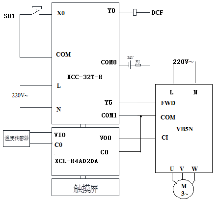 储水箱中注入适量水。系统上电后,按下启动按钮,电磁阀打开,备用水箱中的水流入储水箱中,液位传感器工作,触摸屏显示水位高度。当水位到达高液位时,电磁阀关闭,不再进水。延时6秒后,抽水泵开始工作,将水抽入备用水箱中,抽水速度由模拟量来控制。当储水箱中水位低于低液位时,停止抽水。
