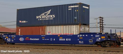 (3)80ft集装箱专用车。它具有4个TEU箱位,适合装载2个13m(40ft)集装箱。1961年在美国最先使用。