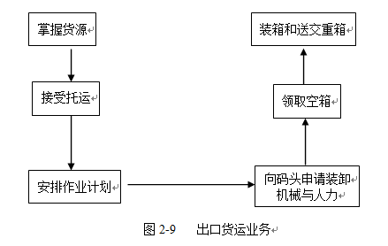 港口出口货运业务是指发货人通过集装箱卡车,将集装箱重箱送达起点港,装上集装箱班轮,运往目的港的货运业务。一般流程如下图2-9所示: