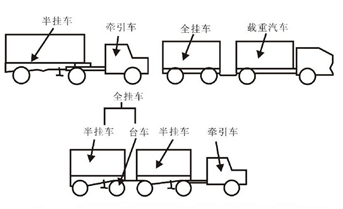 ① 按拖带挂车的方式分为半拖挂方式、全拖挂方式和双联拖挂方式。如图2-5所示