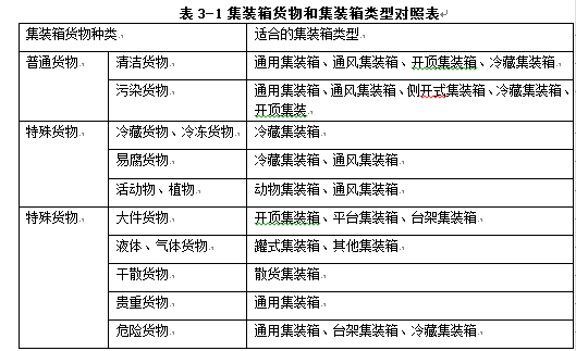 (2)集装箱类型的选择。目前使用的集装箱有通用集装箱、冷藏集装箱、罐式集装箱、干散货集装箱等多种类型,不同类型的集装箱是根据不同类型货物及运输的实际要求而设计制造的。对集装箱箱型种类的选择主要应根据货物的种类、性质、包装形式和运输要求来进行。如对运输没有什么特殊要求的普通干散货物,可选择使用最普通的封闭式干散货箱;含水量较大的货物或不需要保温运输的鲜货等可选择使用通风式集装箱;在运输途中对温度有一定要求的货物可选择使用保温、冷藏、冷冻集装箱;超高、超长、超宽或必须用机械(吊车、叉车等)装箱的货物可选择使用开顶、板架、平台式集装箱;散装流体货物可选择罐式箱;牲畜、汽车等可选择相应的特种箱等。根据货物的性质分类的集装箱货和相应采用的集装箱类型可参考表3-1