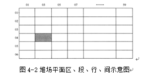 (1)码头堆场区、段的划分。集装箱码头堆场总面积较大,根据码头堆场的位置,往往将整个港区堆场划分为若干个分堆场,如1号堆场、2号堆场、3号堆场等。对每一个分堆场可再划分若干个区,如1区、2区、3区等。然后再对每一个区划分为若干个段,并用代号表示,如A段、B段、C段等。每个段的形状为矩形。其宽度为6个标准箱的宽度(应留有一定的空隙),因而每个段的宽度可表示为6行,用01、02、03、04、05、06表示。每段的长度通常为30个6.1m(20英尺)标准箱的长度。因而每行有30个6.1m(20英尺)箱长度方向的堆放位置,每个位置表示为间,用01、03、05、07、09……57、59表示,共30个间位。图4—1所示为堆场平面区、段、行、间示意图。