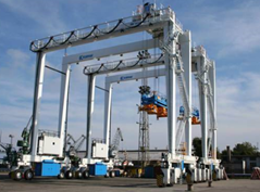 跨运车是以门型车架跨在集装箱上,由吊具的液压升降系统吊起集装箱进行搬运和堆码。它采用旋锁机构与集装箱结合或脱开,吊具能升降,以适应装卸堆码要求,吊具还能侧移、倾斜和微动,以满足对箱位的要求。