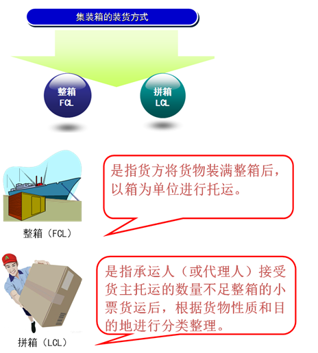 根据集装箱货物装箱数量和方式可分为整箱和拼箱两种。