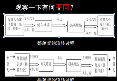 第五步: 王大力仔细观察,开动脑筋,对侯梦宇说: “整箱货发货人直接自己装箱送到发货地码头堆场,通过运输在目的地堆场卸下直接可以交给收货人;而拼箱货要送到货运站拼装,然后进堆场,通过运输到达目的地堆场,要再次进入货运站,拆箱后再交给收货人,我懂了!” 侯梦宇说“孺子可教”。 |