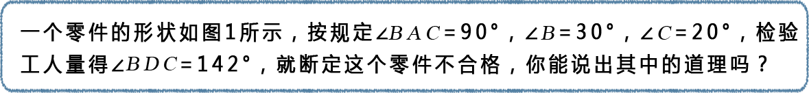 ∵∠1=∠2+∠C ∠3=∠4+∠B ∴∠BDC=∠1+∠3 =(∠2+∠4)+∠B+∠C =∠BAC+∠B+∠C =90°+30°+20° =140°. 而量得∠BDC=142° , ∴零件不合格. |