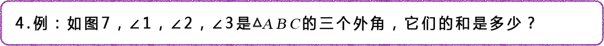 由三角形的一个外角等于与它不相邻的 两个内角的和,得: ∠1=∠5+∠6, ∠2=∠4+∠6, ∠3=∠4+∠5. ∴∠1+∠2+∠3=2(∠4+∠5+∠6). ∵∠4+∠5+∠6=180°, ∴∠1+∠2+∠3=2×180°=360°. |