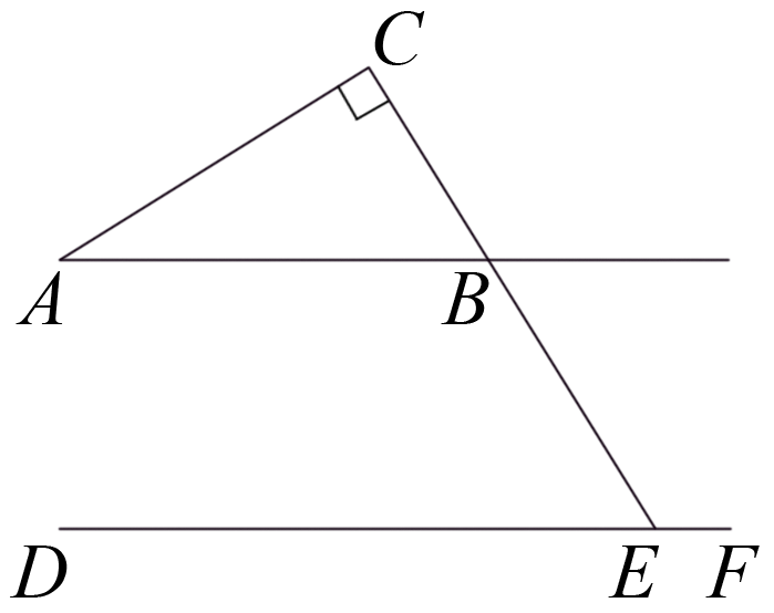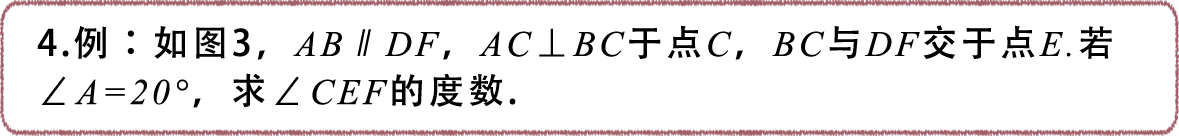 ∵AC⊥BC, ∴∠C=90°. ∴△ABC是直角三角形. ∵∠A=20°, ∴∠ABC=90°-∠A =90°-20°= 70°. ∵∠ABC+∠ABE=180°, ∴∠ABE=180°-∠ABC =180°-70°=110°. ∵AB∥DF, ∴∠CEF=∠ABE=110°. 这道题还能用其他方法解决,同学们可以尝试去完成. |
