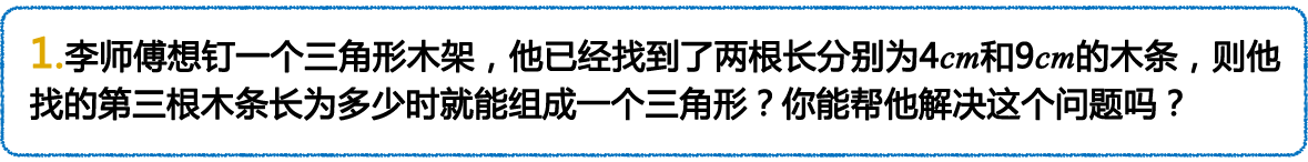 现在我们就能帮李师傅解决刚开始提出的问题了,第三根木条的长只要大于5cm且小于13cm就可以围成一个三角形.