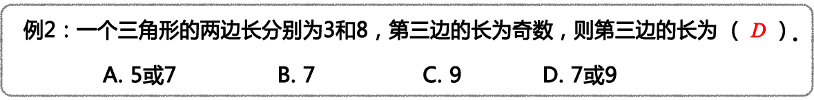 若设第三边的长为x,根据三角形的三边关系可知, 8-3<x<8+3 即5<x<11 ∵x为奇数 ∴x=7或9,故选D. |