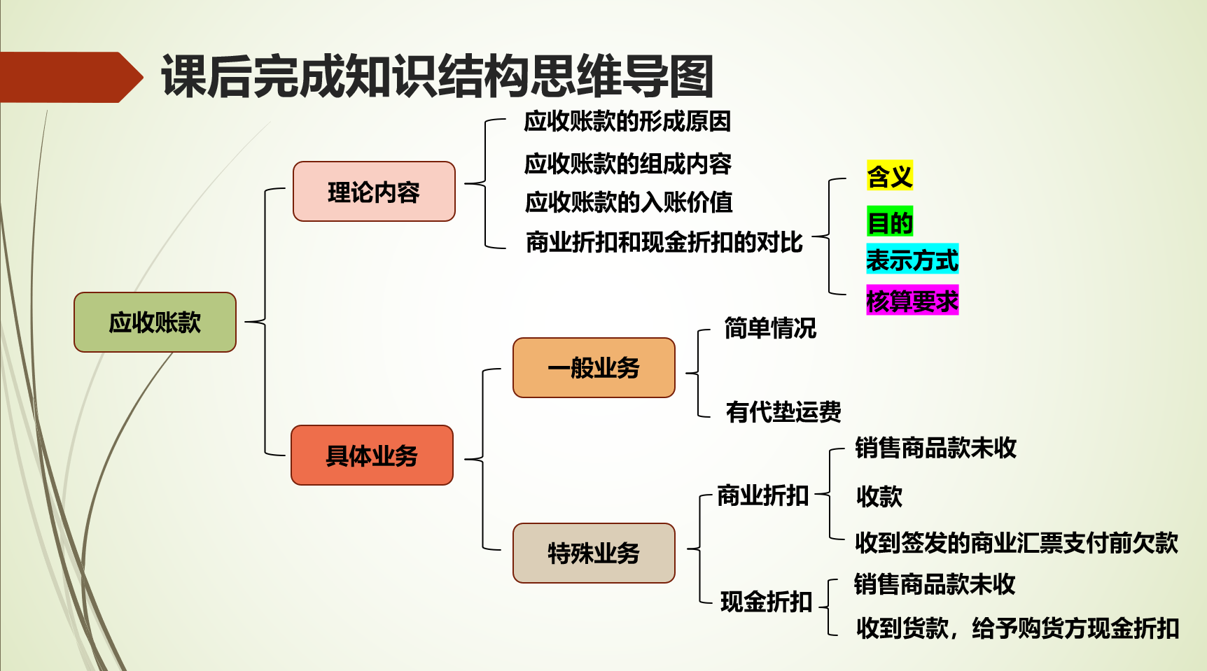 课堂 小结 | 通过本次课的教学使得同学们能够理解应收账款形成的原因,掌握商业折扣和现金折扣情况下应收账款的核算。5分钟 |
