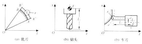 刀具补偿可分为:如图刀具长度补偿、刀具半径补偿和刀具磨损量的补偿,铣刀主要考虑刀具半径补偿、钻头主要考虑刀具长度补偿、车刀主要考虑两个坐标的长度补偿和刀具半径补偿,刀具编号、长度、半径和磨损量等参数事先要存入CNC的刀补参数表中,不同的刀补号对应着不同的参数,编程人员在编程时,通过调用不同的刀补号来满足不同的刀补要求。