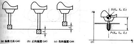 ①铣床和钻床的刀具长度补偿,如图3.10所示,若用标准刀具对刀后,并且知道所更换刀具比标准刀具长或短L,则要用要加G43正向偏置或G44负向偏置指令,来计算测量基准点的坐标