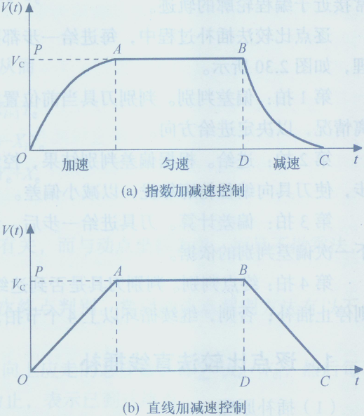 由于机床的运动存在惯性,因此,在进行启动和停止时要进行加减速度控制,使速度曲线沿一定斜率上升或下降,保证系统不产生失步或超调。图3.19所示为两种常用的加减速度控制方法的速度曲线,分别称为指数加减速控制和直线加减速控制曲线。