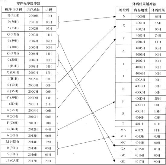 图3.8所示为零件程序译码过程示意图,假设译码结果缓冲器的起始地址为4000H。N后面的两个未压缩字节00H、05H,压缩成为一个字节的BCD代码后“05H”后,存入译码结果缓冲器N代码的对应单元4000H中。G90属于GC组,在译码结果缓冲器对应的4017H中存放“90H”,G01属于GA组,在译码结果缓冲器对应的4015H中存放“01H”,接着读入代码X或Y后面的紧跟的坐标值,这时需要将这些坐标值的内码进行拼接,并转换成2个字节的二进制数的补码,检查无误后存入相应的一码结果缓冲器地址区。。如此重复进行,一直读到结束字符LF后,才进行相关的处理,并返回主程序。对该程序段中没有出现的功能代码,则保留其初始结果(上一程序段的译码结果不变,也就是所说的模态指令)。这样一码结果就包含了CNC后续执行的所有信息和数据。