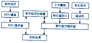通过输入装置输入到CNC中的程序段,一般先存放在MDI键盘缓冲器或零件程序缓冲器,其规模比较小,只能存放一个或几个程序的数据段,主要用作输入装置和CNC之间的速度匹配,是零件程序输入和执行程序的重要组成部分。然后再传送到CNC中的零件程序存储器。规模较大,可存放许多完整的零件程序。零件程序的输入和译码执行传送过程如图3.6所示。