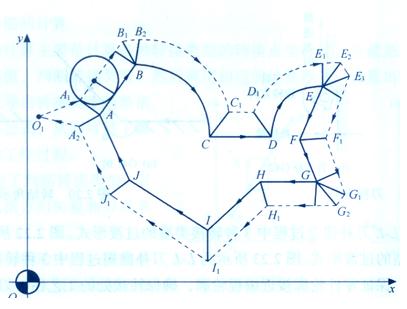 图4.18是某连续轮廓轨迹刀具半径补偿示意图,起到点在O1处,从O1到A直线插补并建立刀补G41,否则,将会铣掉A处的刀具半径的圆弧,不再是直线与直线过度,形成废品。整个过程中刀补已知进行,如果想从A2回到原来起到点O1,要撤销刀补G40否则,回不到O1,