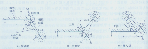 一般CNC加工轨迹仅限于直线与直线(L-L)、直线于圆弧(L-C)、圆弧与直线(C-L)、圆弧与圆弧(C-C)根据两轮廓段交点处在工件侧的夹角