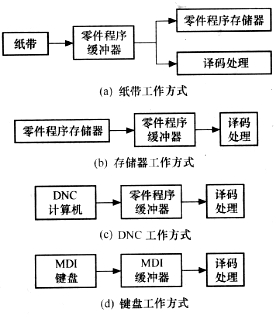 纸带工作方式—从纸带阅读一段程序到零件程序缓冲器,可以一边传送一边译码执行直到零件程序传送和执行完,同时纸带的零件程序分段传送到CNC的零件程序存储器保存。