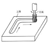 (2)直线控制数控机床—不仅要控制机床从一点移动到另一点,而且要沿直线轨迹(一般与坐标轴平行或成45°角的移动而且切削,简易数控车、铣机床,目前已经淘汰,直线控制的切削,实际是数控系统不进行插补,只进行进给脉冲的分配,图1.11 是直线控制机床加工工艺图