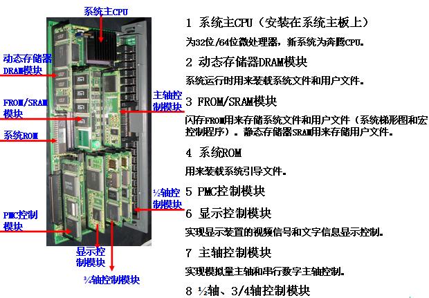 是数控系统的核心,数控机床的各项控制任务均由数控装置完成。作用是对输入装置传送的数控加工程序进行译码、插补、刀补、速度计算、逻辑判断处理,将进给位移、速度输出到伺服接口、将主轴速度输出给主轴接口,由PLC输出辅助运动控制信号给机床电气控制后驱动辅助部件工作。图1.3是CNC内部部件图