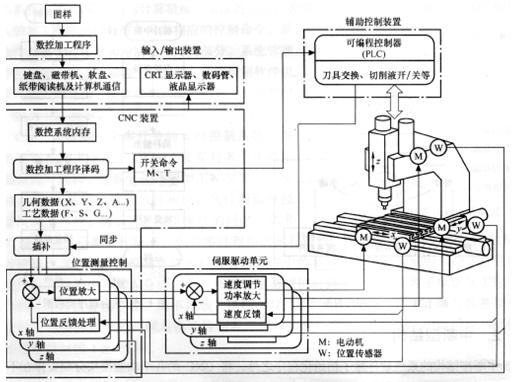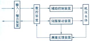 数控机床一般由输入/输出装置、数控装置、辅助控制装置、伺服驱动装置、测量反馈装置和机床本题组成如图1.1所示