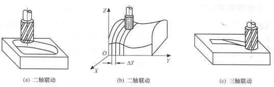 (3)轮廓控制类数控系统—两轴联动或三轴以上联动可以保证机床沿平面或空间任意曲面进行连续加工,图1.12是不同联动轴数所能加工的型面,更为复杂的零件可以有5轴以上联动轴的加工中心来加工,如1.12和1.13。