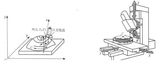 图1.12 5轴联动铣削曲面零件 图1.13 6轴加工中心坐标示意图