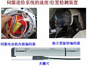 测量反馈装置由测量传感器和测量转换电路构成,其作用是测量机床移动部件的位移速度和转向、反馈到伺服驱动器实现电流、速度闭环控制。位置反馈到CNC实现插补控制。根据检测元件安装的位置可分为半闭环控制和全闭环控制。图1.6是光栅尺和光电编码器图。