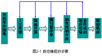 数控编程(NC programming) :简单说是从零件图纸到生成存储介质程序的全过程。根据零件图样,将零件的加工信息:加工顺序、零件轮廓轨迹尺寸、工艺参数(F、S、T)及辅助动作(变速、换刀、冷却启停、工件夹紧、松开等)等,用规定的文字、数字、符号组成的代码按一定的格式编写加工程序单,并将程序单的信息转换成控制介质的数据信息的整个过程。
