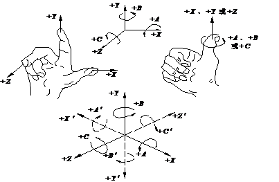 A、B、C坐标分别为绕X、Y、Z坐标的回转进给运动坐标,确定X、Y、Z坐标的正方向后,可按右手螺旋定则来确定A、B、C坐标的正方向。