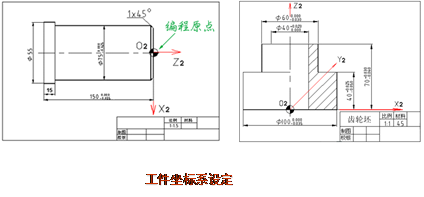 n 在对零件图进行编程计算时,必须要建立用于编程的坐标系,其坐标原点即为程序原点。而要把程序应用到机床上,必须让机床的数控系统知道程序原点在机床坐标系中的坐标,这些需通过”对刀操作”完成。编程坐标系在机床上就表现为工件坐标系,坐标原点就称之为工件原点。